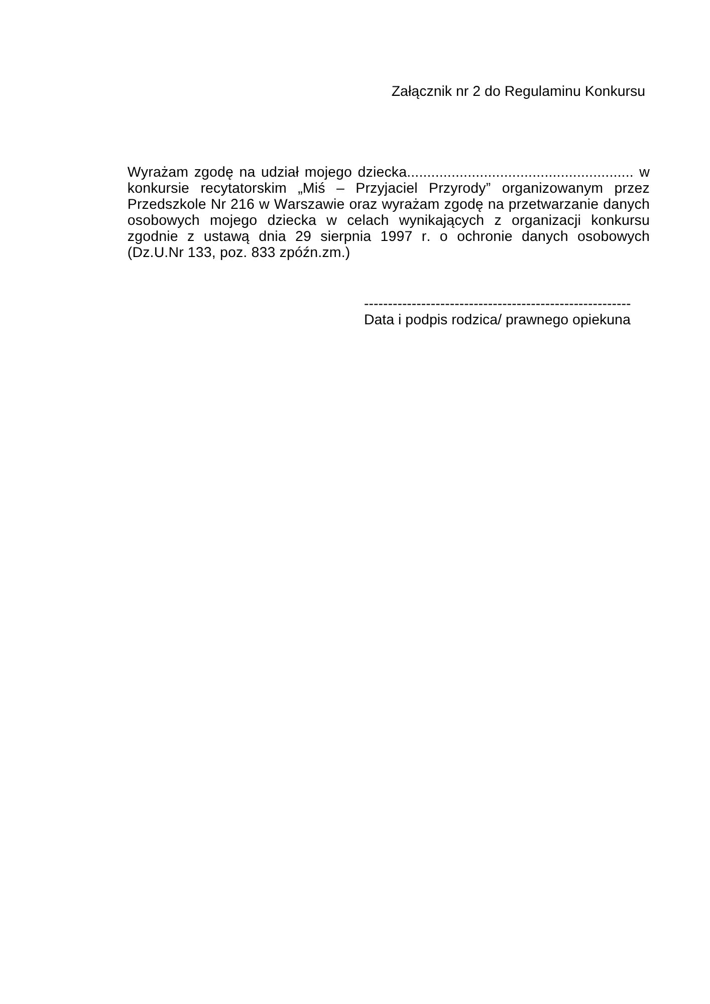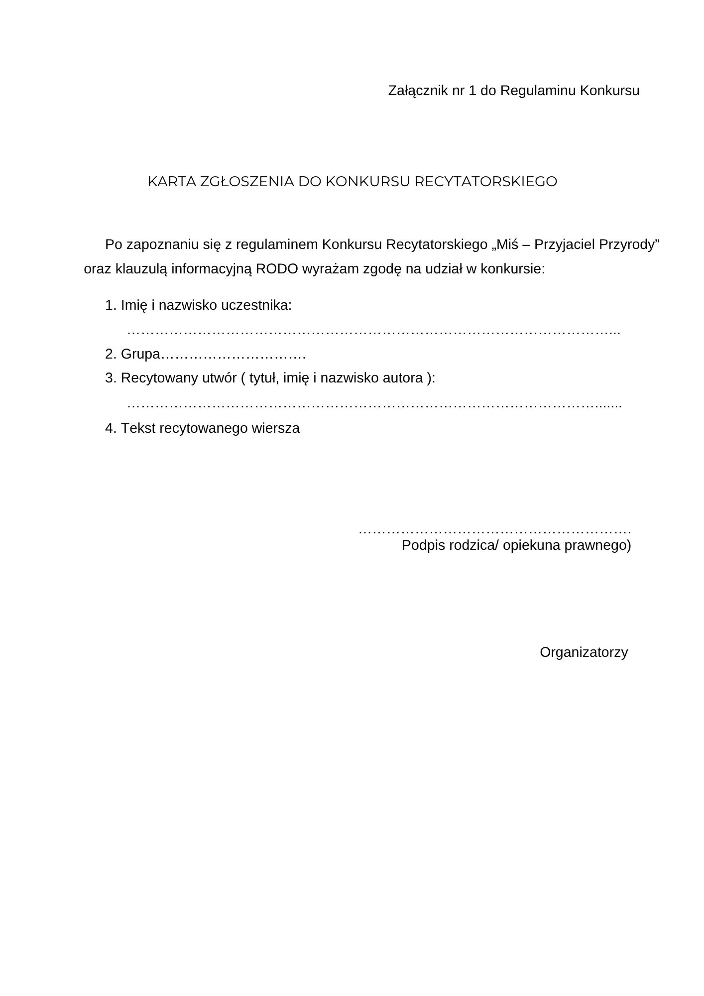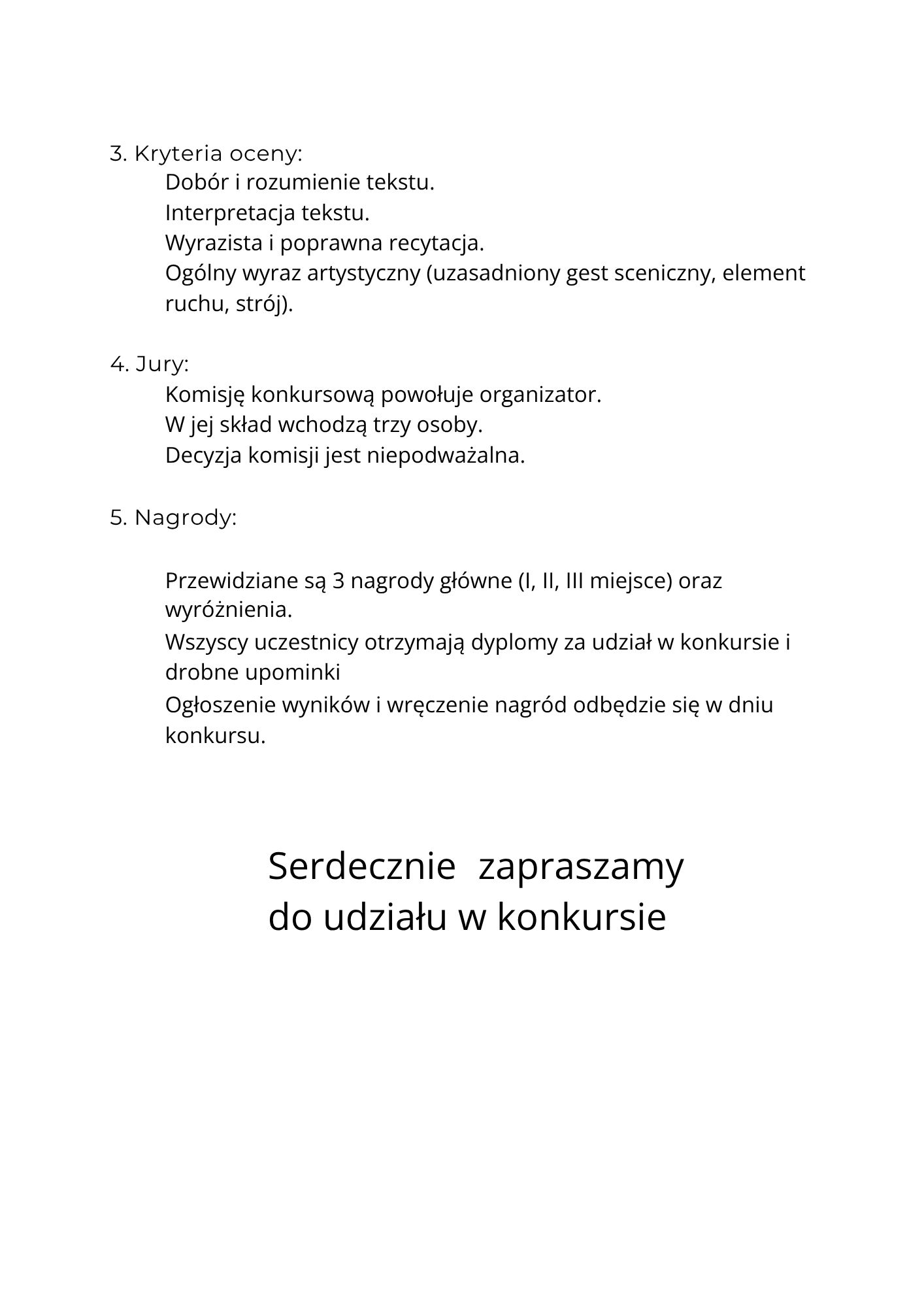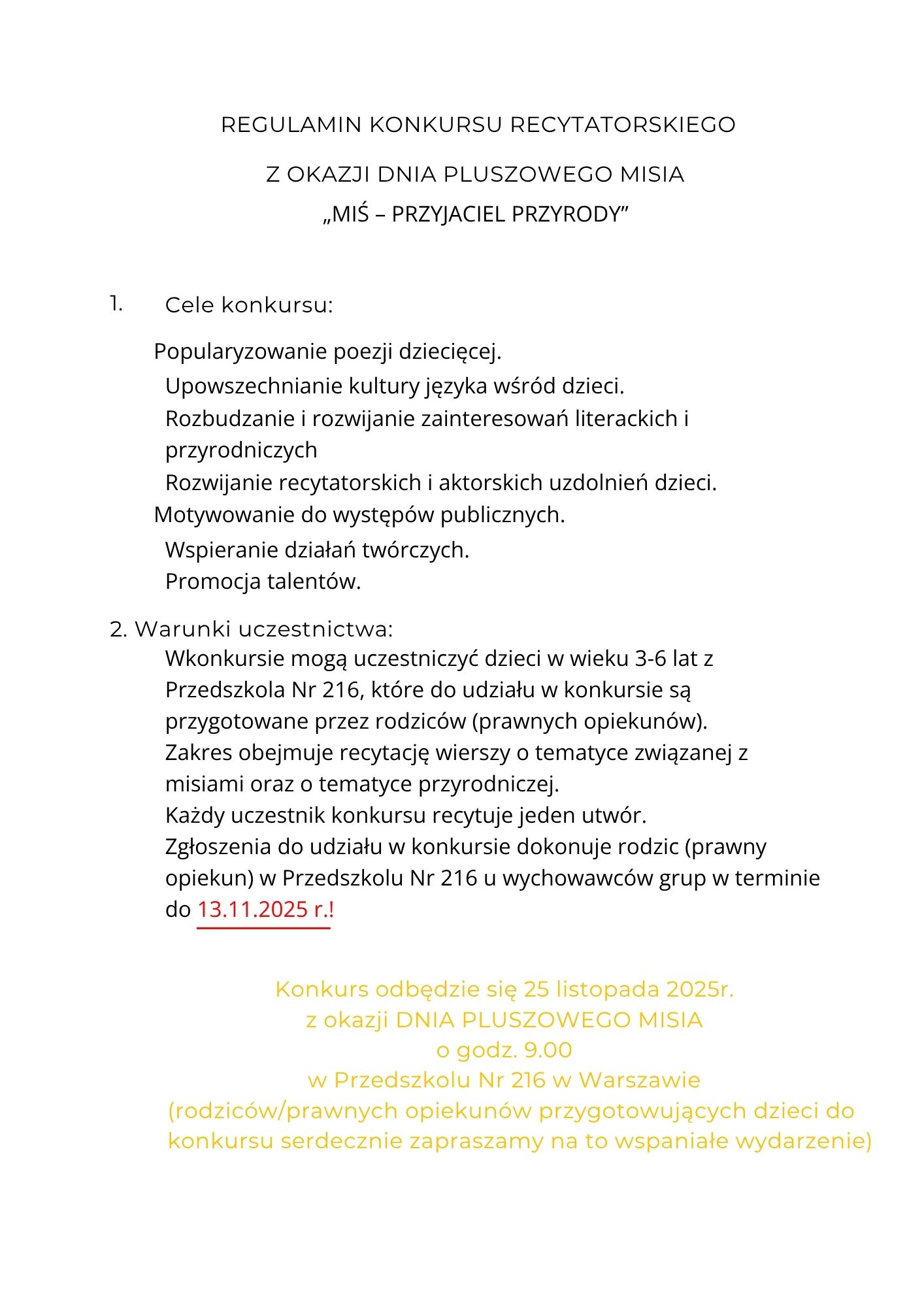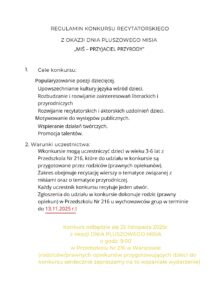 Konkurs recytatorski Post published:2025-11-08 Zapraszamy do udziału w konkursie 😊.Po „kliknięciu” w plakat otworzy się Regulamin i załączniki. Może ci się spodobać również Ogłoszenie o zamówieniu – REMONT NAWIERZCHNI ORAZ NAPRAWA WYPOSAŻENIA PLACU ZABAW PRZY PRZEDSZKOLU NR 216 W WARSZAWIE 2025-06-30 Rodzice – dzieciom 2024-05-23 Zbiórka kart zbliżeniowych 2025-06-17